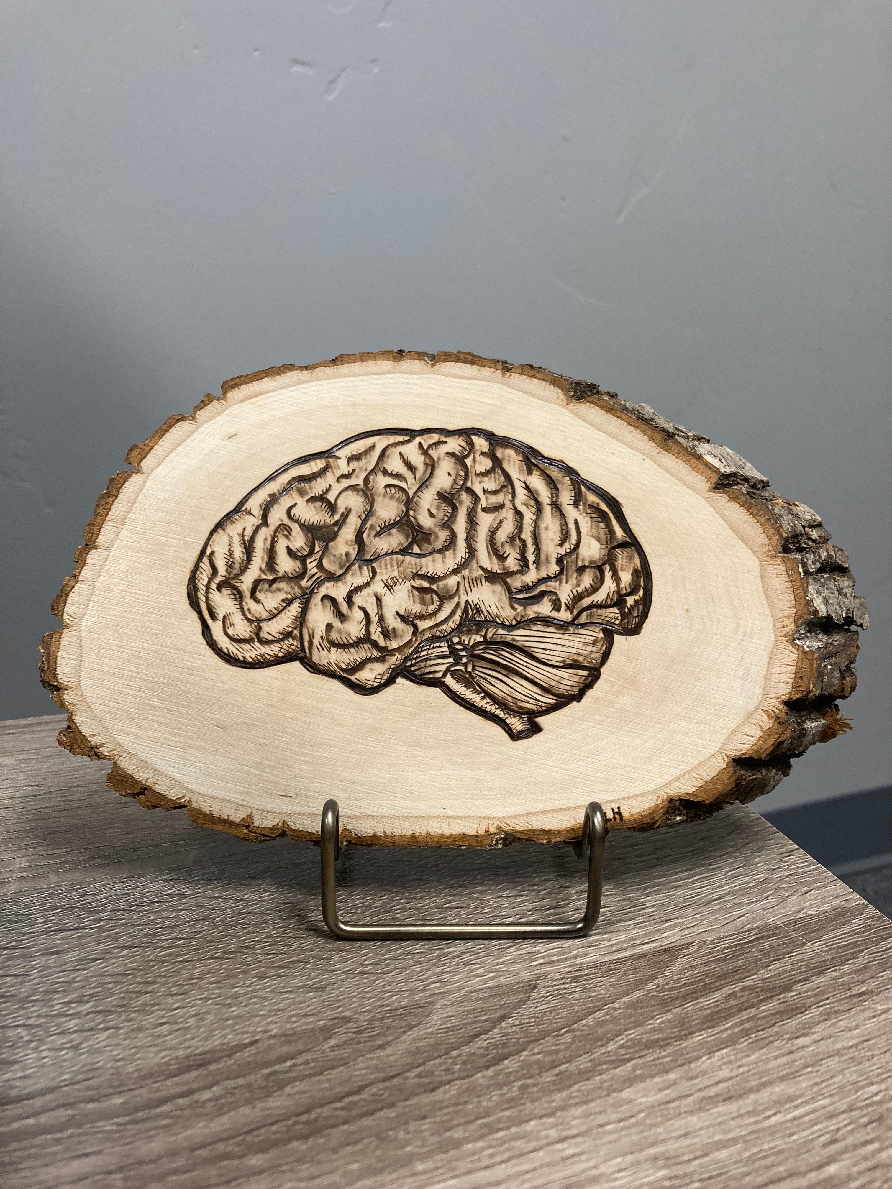 This is a wood burning of the brain courtesy of my husband. In this rendering, the brain stem is on the right, the frontal lobe is on the left.
